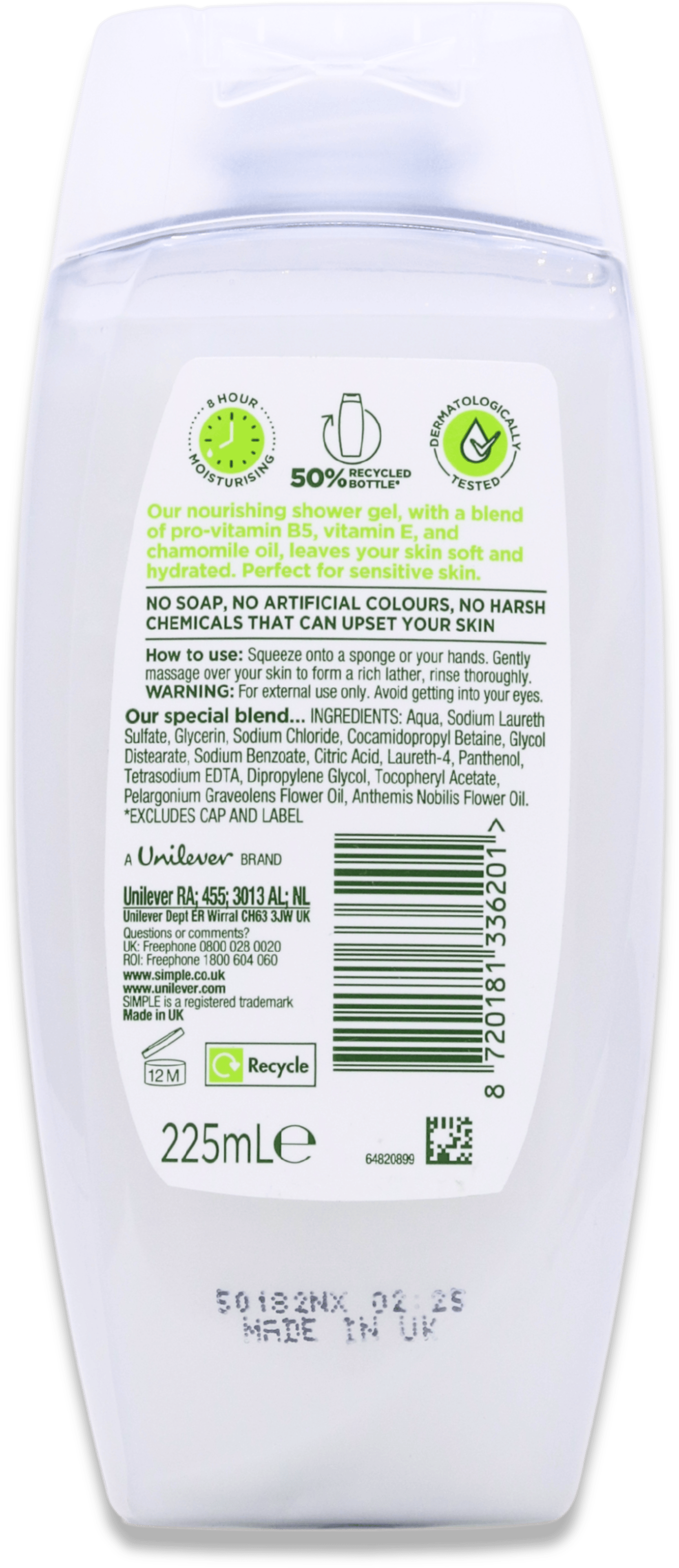 Simple Kind to Skin Nourishing Shower Gel 225ml is a skin-friendly shower gel suitable for all skin types, including dry, sensitive, and normal skin. Enriched with Pro-Vitamin B5, chamomile oil, and cucumber extract, it provides a soothing and refreshing experience. Dermatologist tested, this shower gel is free from harsh chemicals, perfume, and animal ingredients, making it perfect for daily use.
