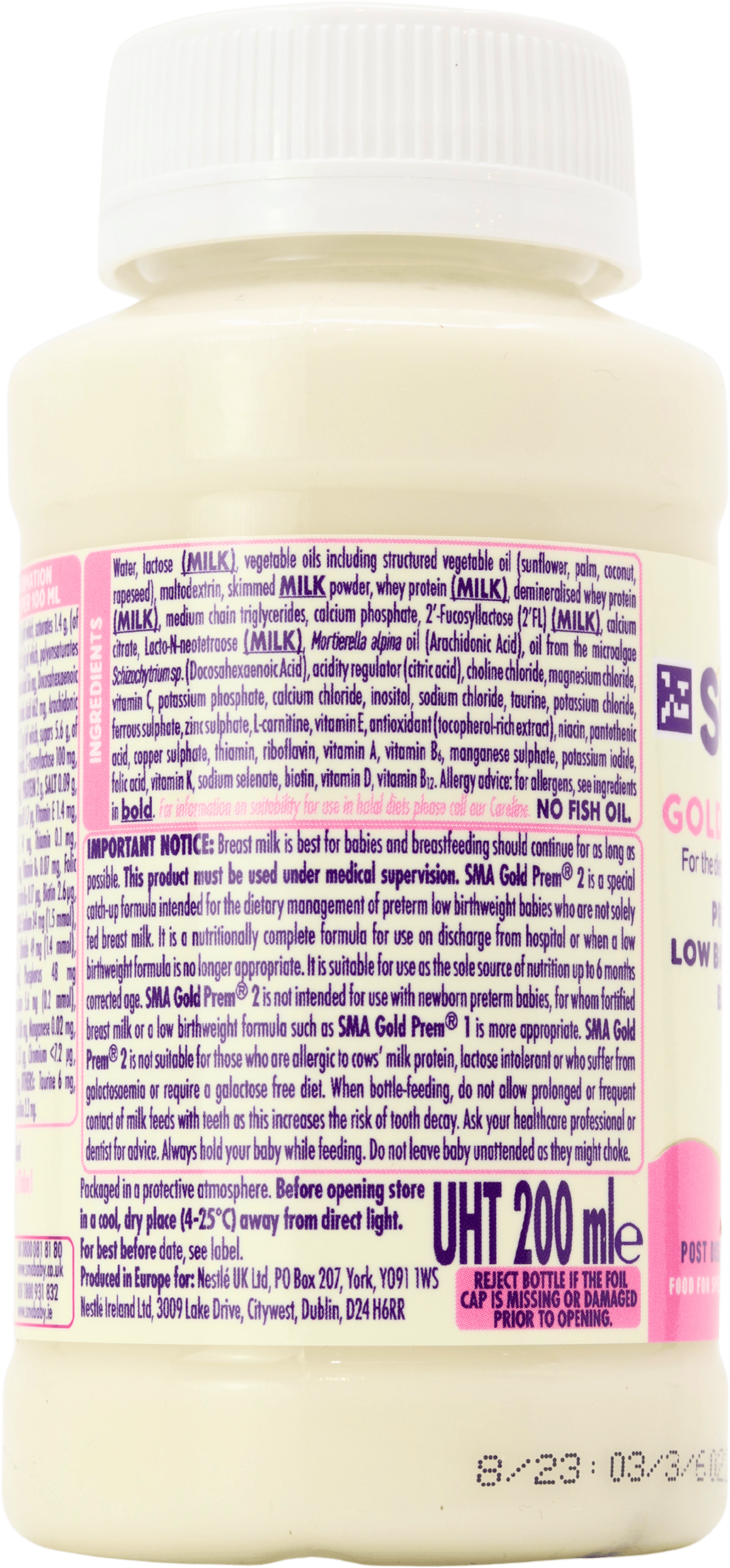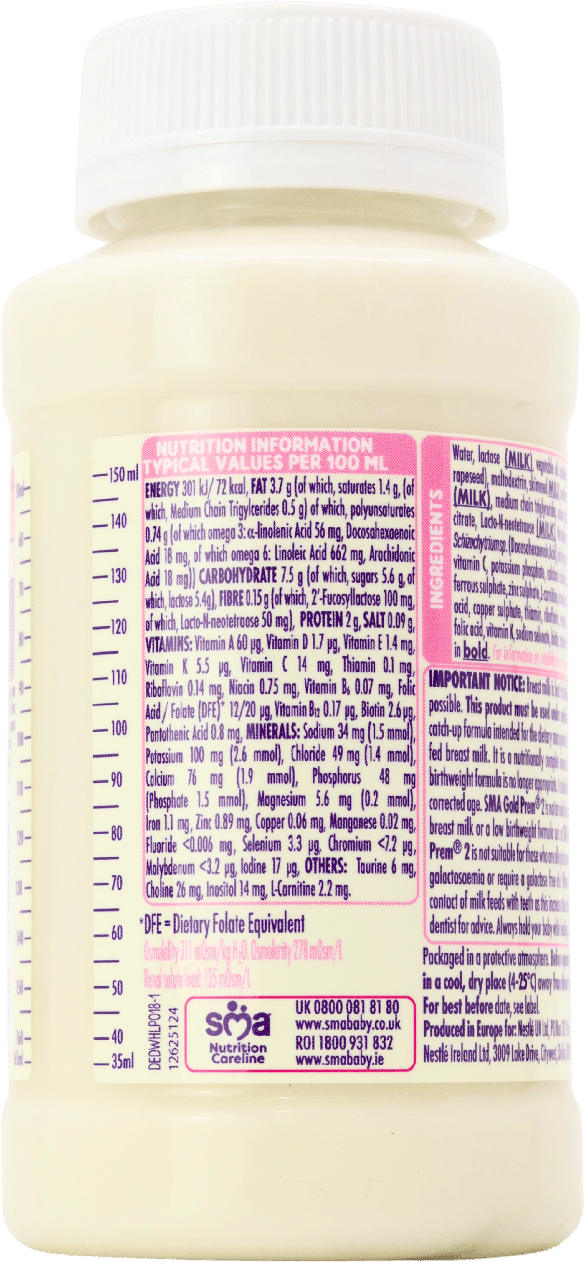 Water, partially hydrolysed whey protein (MILK), lactose (MILK), vegetable oils including structured vegetable oil (sunflower, palm, rapeseed, coconut), maltodextrin, medium chain triglycerides, calcium phosphate, potassium hydroxide, Docosahexaenoic Acid (FISH oil), Arachidonic Acid (Mortierella alpina oil), acidity regulators (citric acid, phosphoric acid), potassium chloride, magnesium chloride, choline bitartrate, vitamin C, sodium chloride, sodium hydroxide, L arginine, inositol, taurine, ferrous sulphate, nucleotides (cytidine-, disodium uridine-, adenosine-, disodium guanosine-5’-monophosphate), zinc sulphate, vitamin E, antioxidants (ascorbyl palmitate, tocopherol-rich extract), L-carnitine, pantothenic acid, niacin, copper sulphate, thiamin, riboflavin, vitamin A, vitamin B6, manganese sulphate, potassium iodide, folic acid, vitamin K, sodium selenate, biotin, vitamin D, vitamin B12.