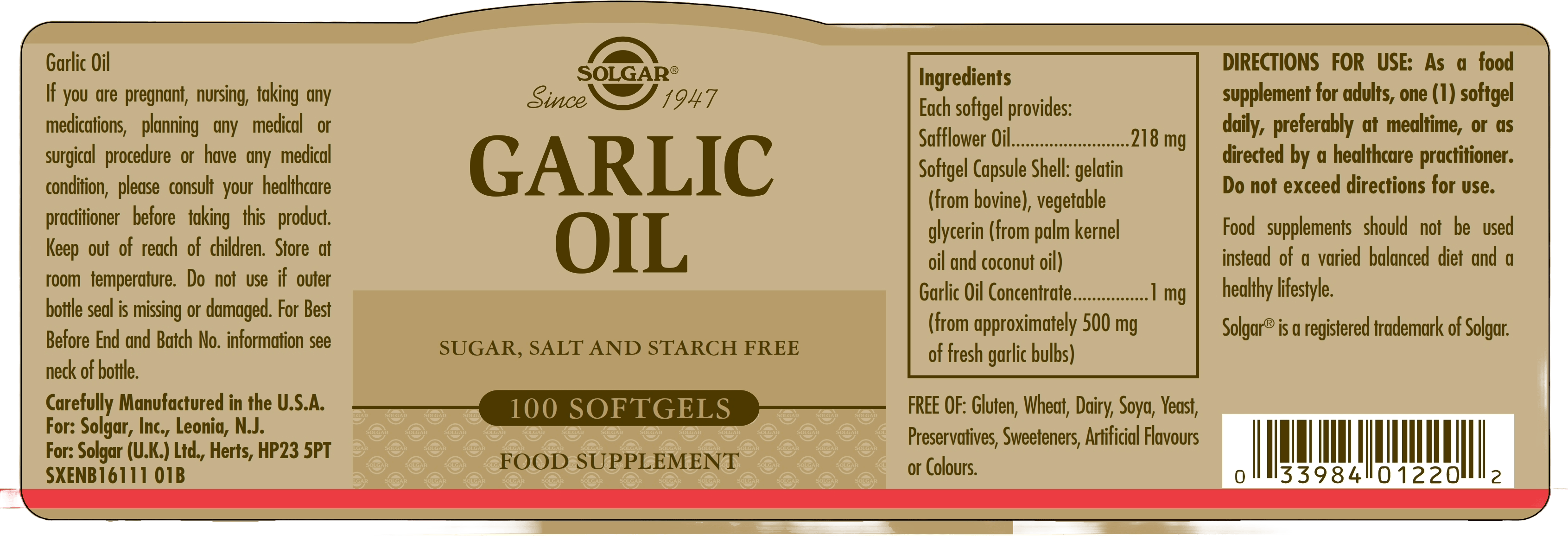 Solgar Garlic Oil Softgels are primarily made up of garlic oil concentrate (approximately equivalent to 500 mg of fresh garlic bulbs) and safflower oil.
