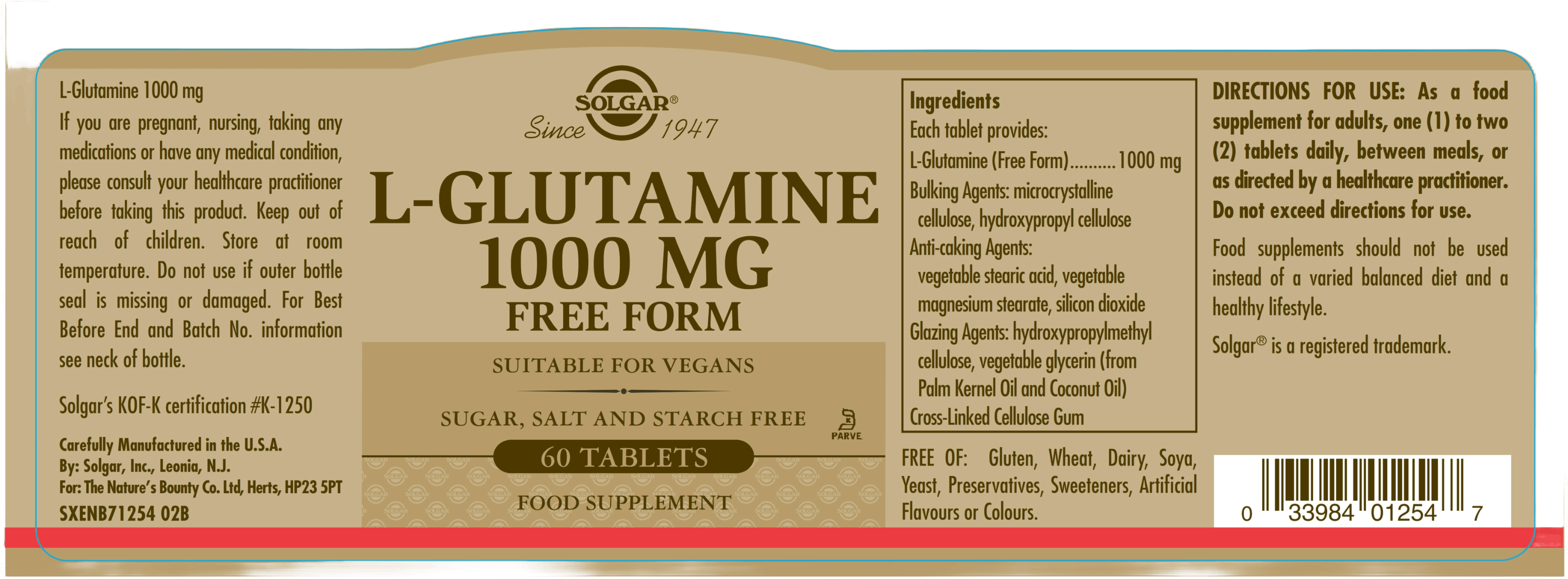 L-Glutamine (Free Form), Bulking Agents: (microcrystalline cellulose, hydroxypropyl cellulose), Anti-caking Agents: (vegetable stearic acid, vegetable magnesium stearate, silicon dioxide), Glazing Agents: (hydroxypropylmethyl cellulose, Vegetable Glycerin (from Palm Kernel Oil and Coconut Oil)), Cross-Linked Cellulose Gum.