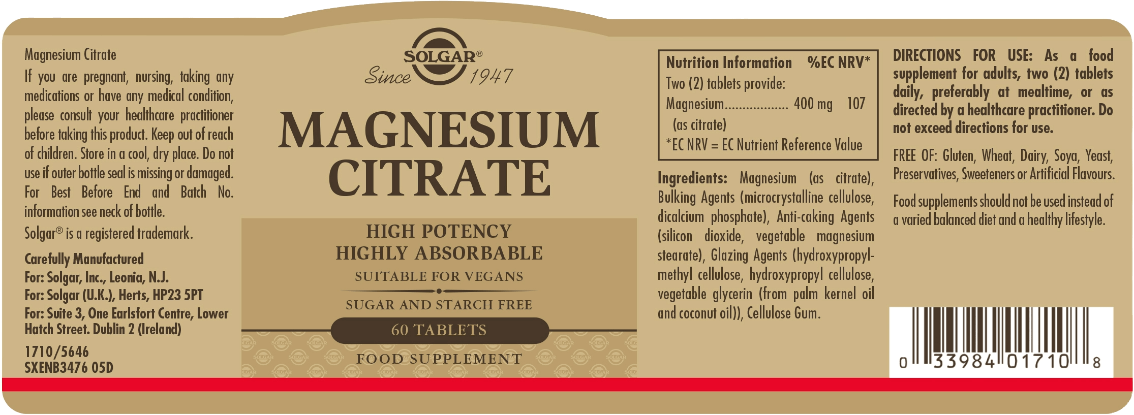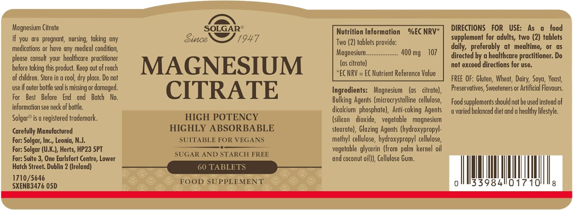 Each serving (two tablets) of Solgar Magnesium Citrate Tablets contains 400mg of magnesium citrate.