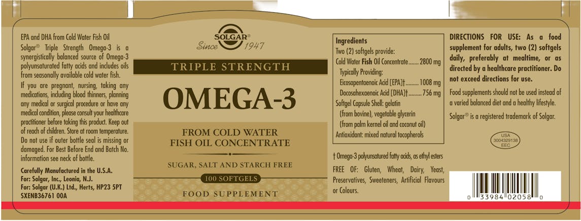 Solgar Triple Strength Omega-3, a premium supplement, is crafted to enhance heart, joint, and skin health. It's ideal for adults aiming to sustain a healthy lifestyle and features the highest concentration of natural Omega-3s available from Solgar. Beneficial for cardiovascular health, these softgels are an effective addition to your daily health routine.