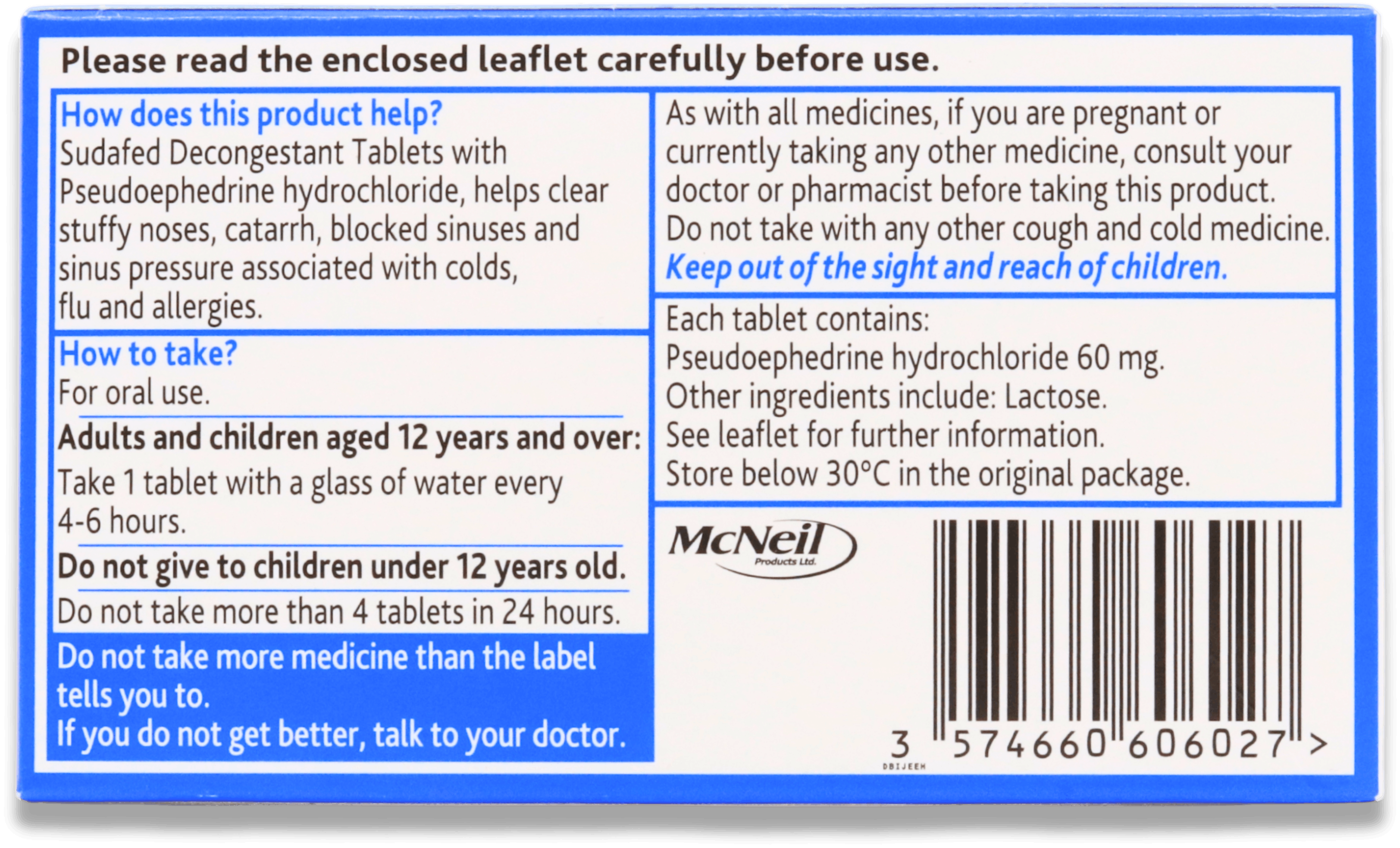 Sudafed Decongestant Tablets offer effective relief from nasal and sinus blockage arising from colds, flu, hay fever, and other respiratory allergies. These tablets come with 120 mg of pseudoephedrine HCl, an efficient decongestant that acts by constricting the blood vessels to reduce swelling and blockage.