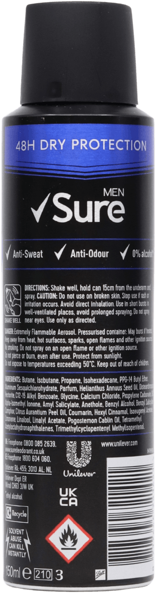 Sure Men 48h Ice Fresh provides dependable antiperspirant defence for active men. Ideal for those seeking to remain fresh and dry, it offers protection against sweat, odour, and clothing marks for an impressive 48 hours. With a refreshing citrus aroma and a formula that is free of alcohol, it ensures skin comfort and keeps attire looking impeccable.