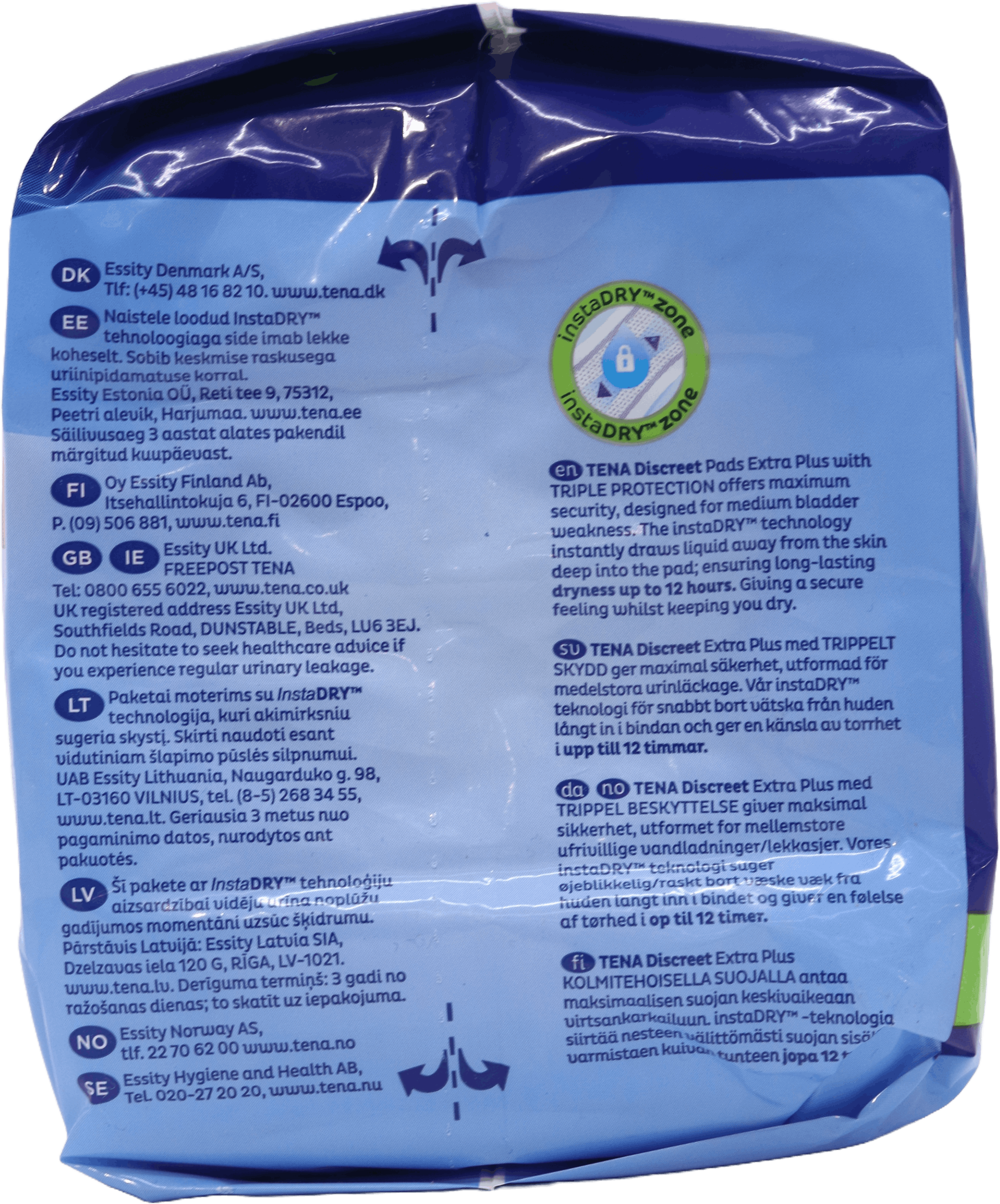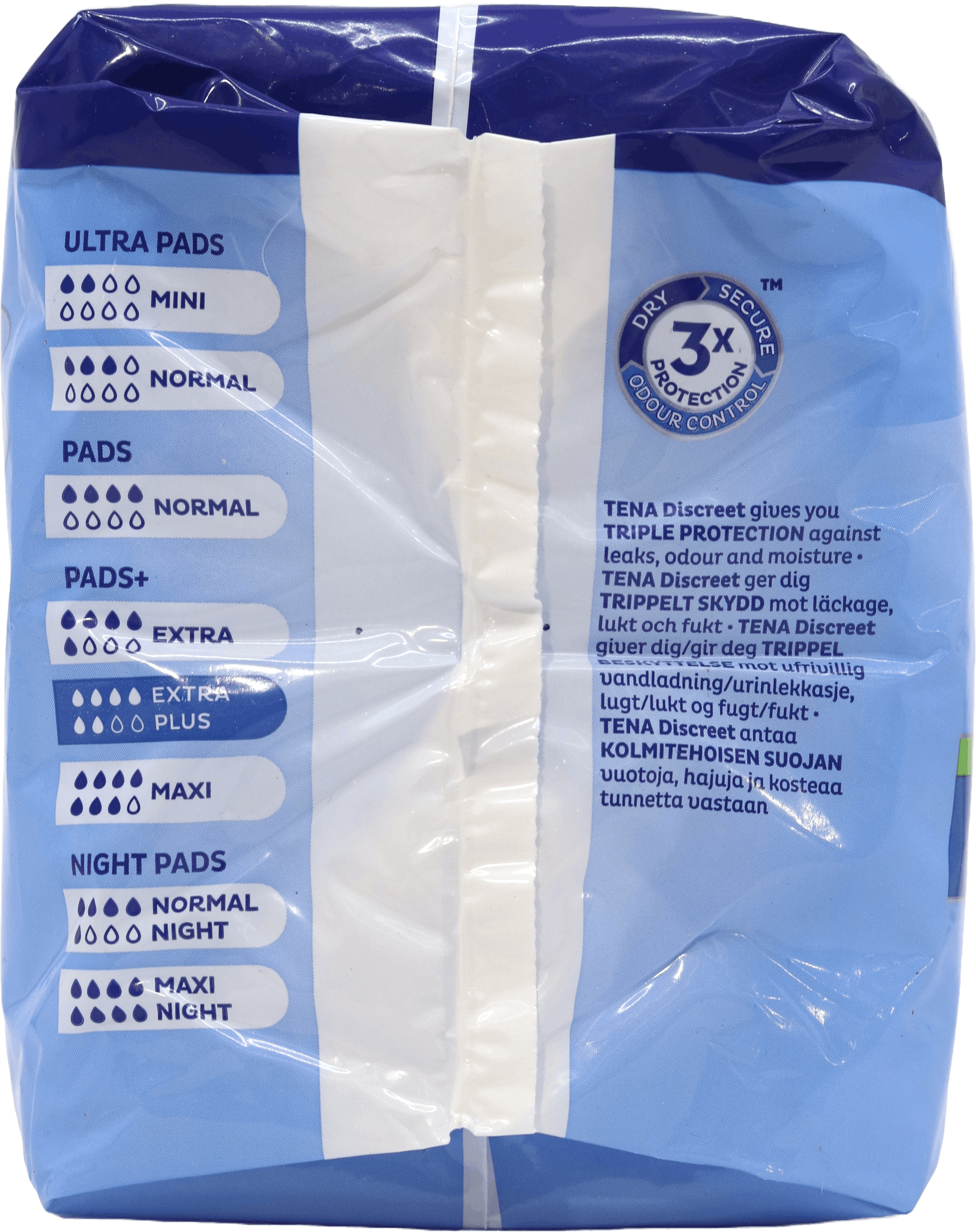 Tena Discreet Extra Plus Pads use InstaDRY™ tech to trap leaks. They keep skin dry and stop smells for up to 12 hours. The shape hugs the body while staying comfy.