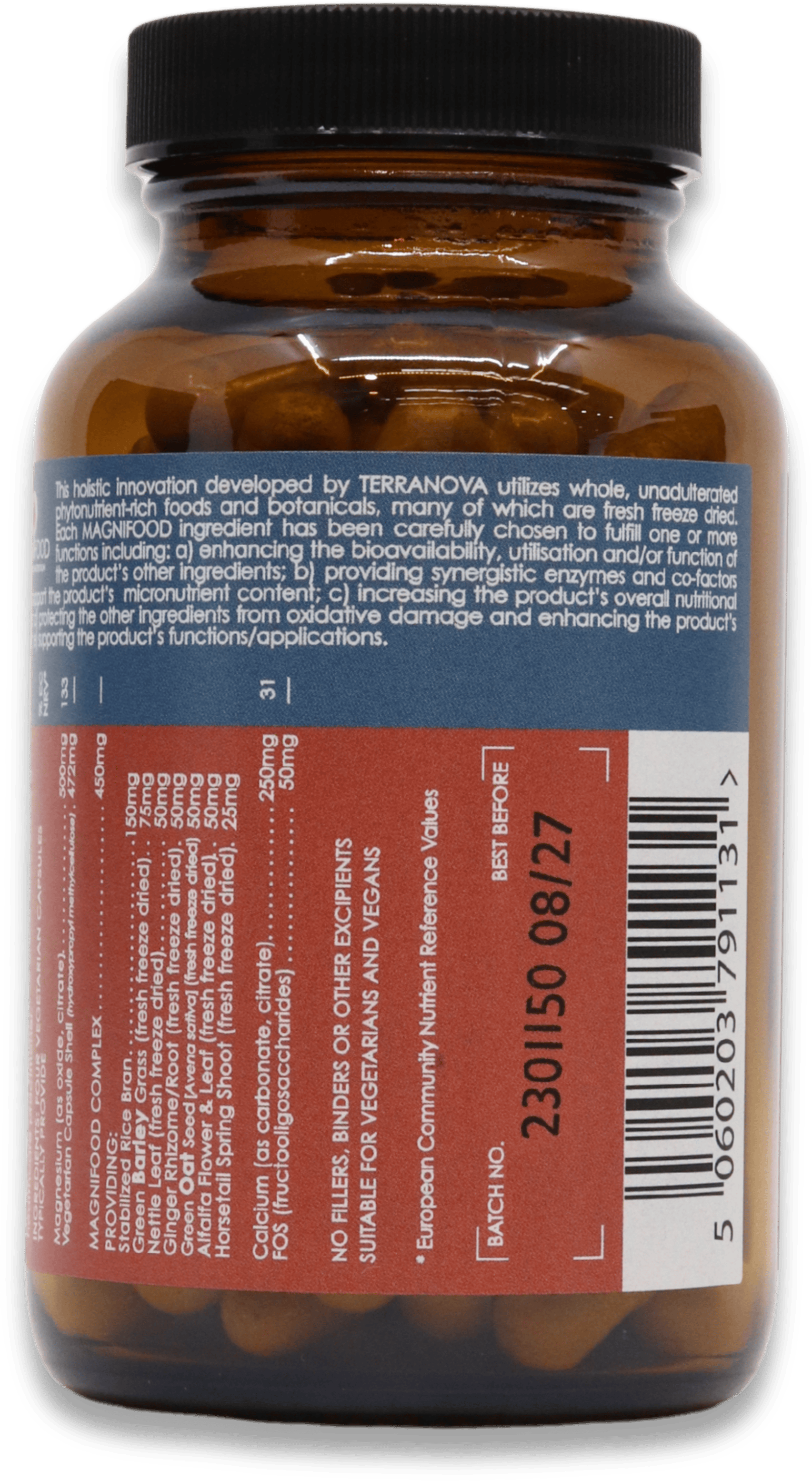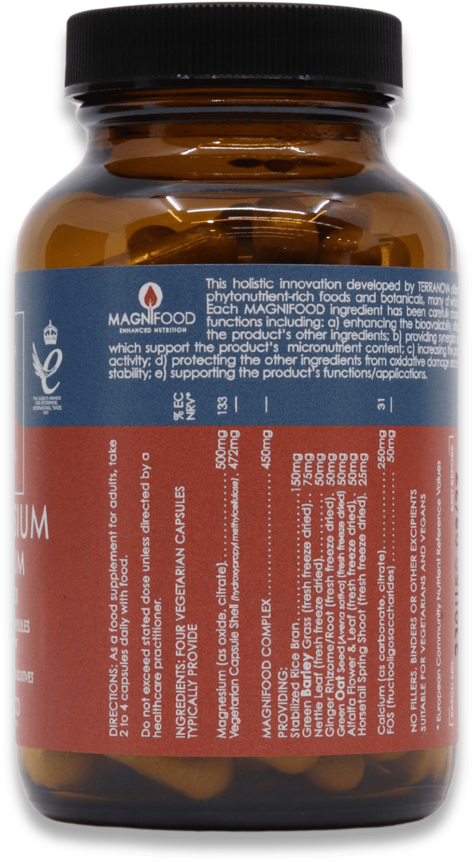 - Includes the Magnifood complex with stabilised rice bran, green barley grass, nettle leaf, ginger root, oat seed, alfalfa, and horsetail