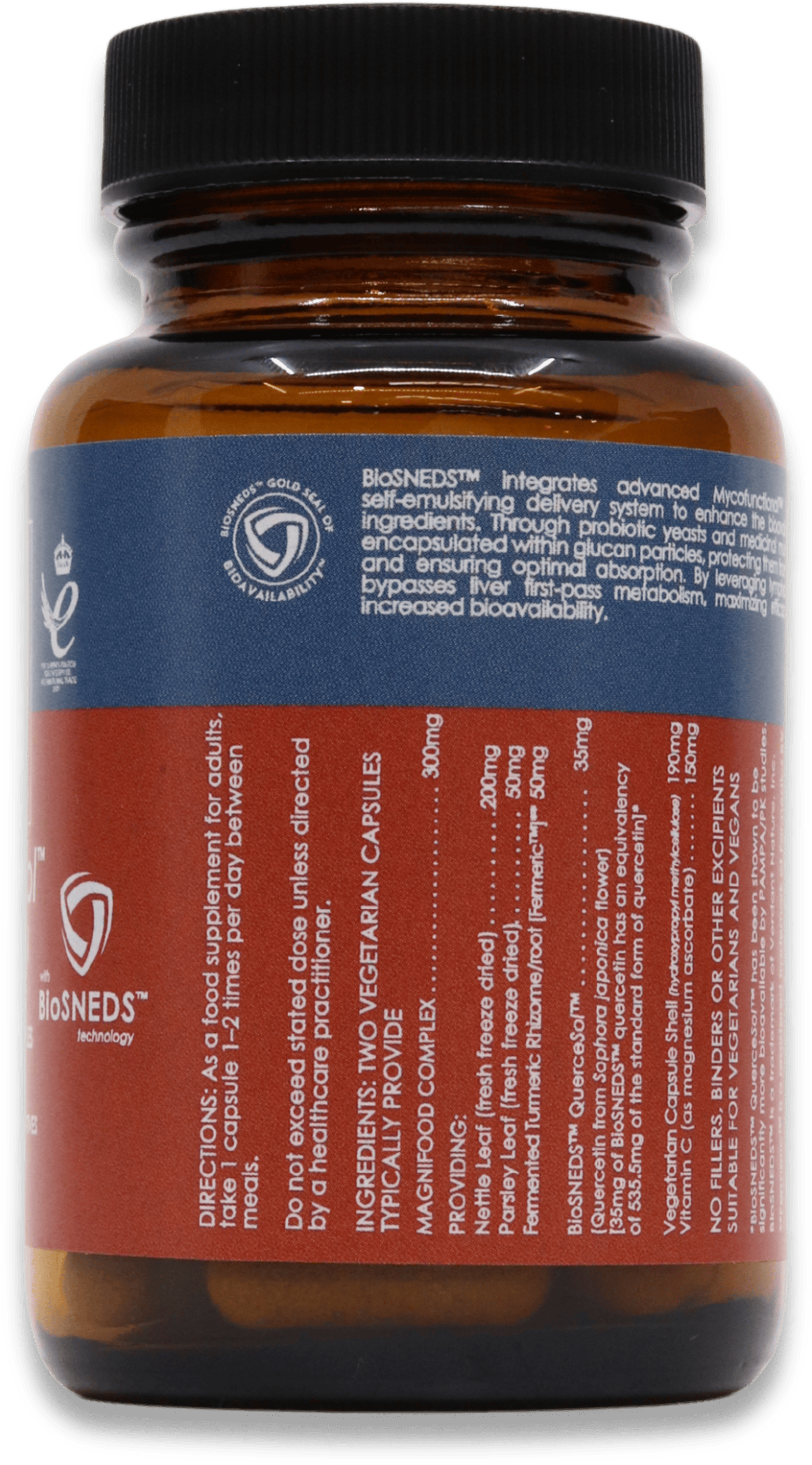 Using the BioSNEDS™ delivery system, quercetin is absorbed more efficiently, improving its action in the body. Combined with vitamin C, nettle, parsley, and turmeric, the formula supports immune function and moderates histamine responses.