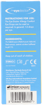 The Eye Doctor Allergy Comfort Eye Drops 10ml are preservative-free eye drops designed to soothe allergy-prone, dry or sensitive eyes affected by pollen, dust, pet dander and other environmental triggers. They use 1% Helichrysum fluid extract in an isotonic, phosphate-free solution to help calm redness, itching and irritation while supporting the natural tear film for lasting comfort throughout the day. Suitable for contact lens wearers and ideal for seasonal allergies or year-round sensitivity, this gentle formula offers convenient relief in a hygienic pump-action 10 ml bottle that stays effective for up to six months after opening.