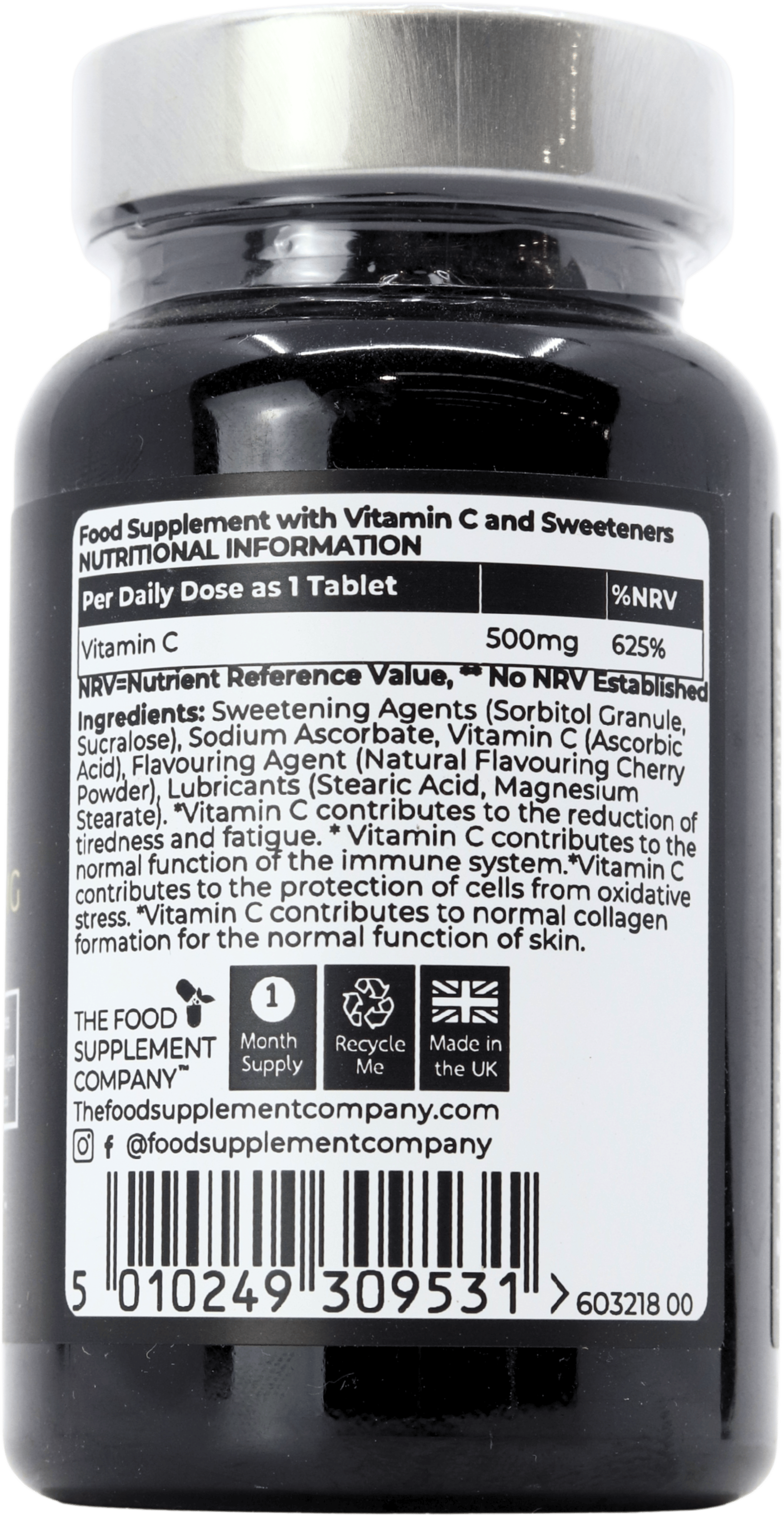 The Food Supplement Company Chewable Vitamin C 500mg 30 Tablets includes citrus bioflavonoids, rosehip powder, hesperidin, and rutin alongside ascorbic acid. In addition, the chewable form and lack of added sugar differentiate it from sugary gummies or large capsules.