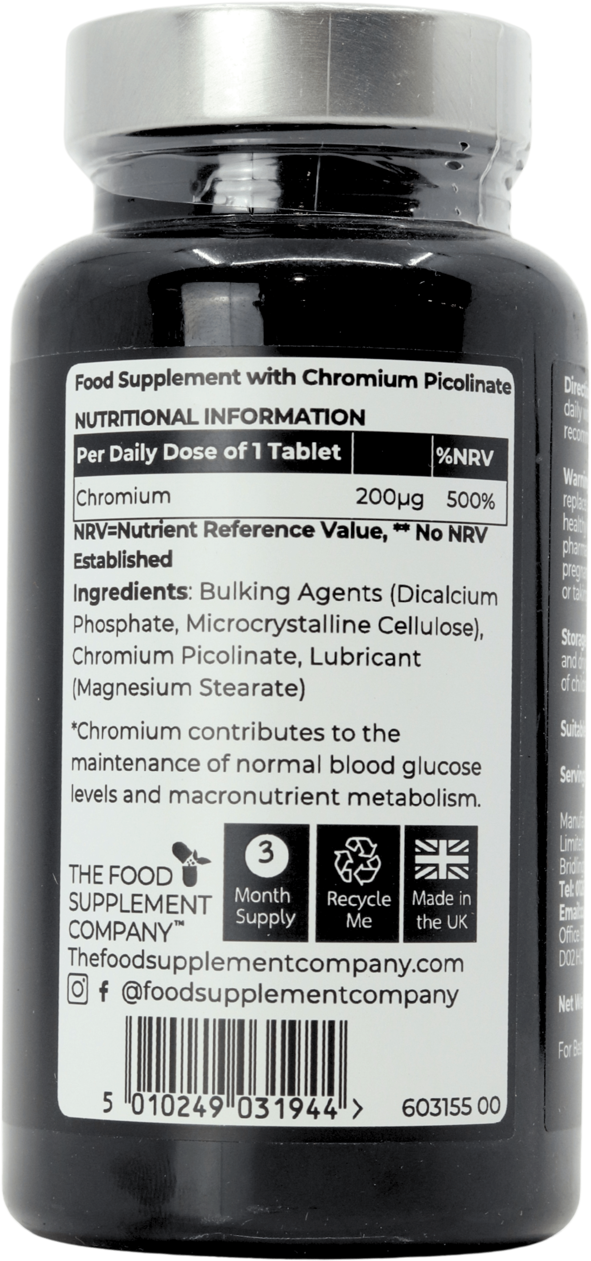 Di Calcium Phosphate (Bulking Agent), Microcrystalline Cellulose (Bulking Agent), Chromium Picolinate, Vegetable Cellulose (Glazing Agent), Magnesium Stearate (Veg Source – Anti-Caking Agent), Vegetable Glycerine (Veg Source – Glazing Agent), Carnauba Wax (Glazing Agent).