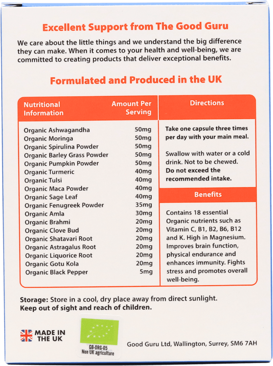 The Good Guru Organic MultiVitamin for Men 60 Capsules supports men’s health needs. It is ideal for men seeking daily energy, immune support, and muscle strength. With 18 organic nutrients, it helps fill diet gaps and boosts well-being. This supplement uses certified organic ingredients, with herbs like Ashwagandha and Moringa, and suits vegan lifestyles.