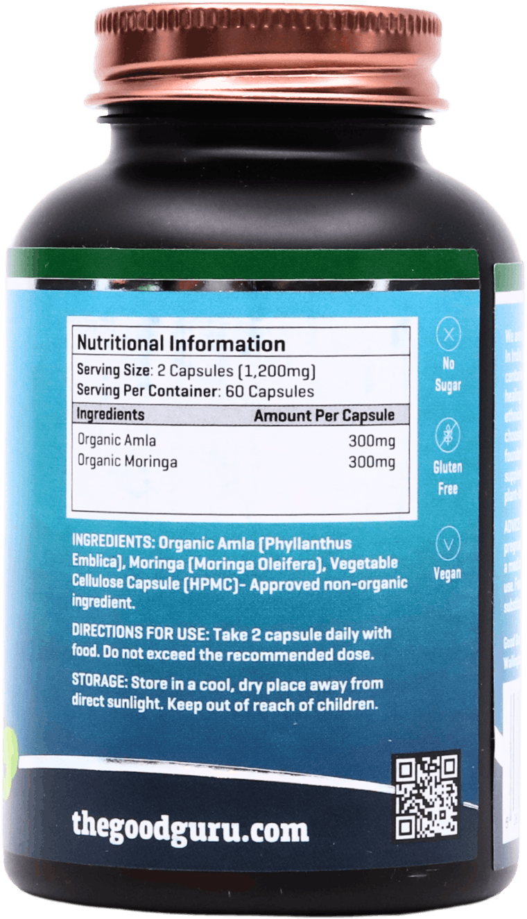 This supplement uses organic sources like Amla and Moringa, providing natural vitamin C and extra plant nutrients for health.