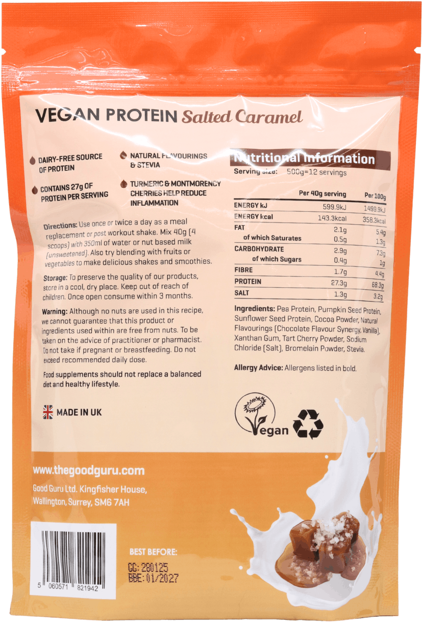 Pea Protein, Pumpkin Seed Protein, Sunflower Protein, Caramel Flavour, Himalayan Rock Salt, Xanthan Gum, Tart Cherry Powder, Bromelain Powder, Stevia.