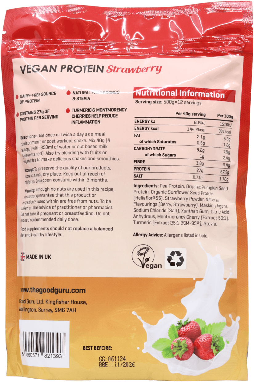 Pea Protein, Organic Pumpkin Seed Protein, Organic Sunflower Protein (Heliaflor®55), Strawberry Powder, Natural Flavourings (Berry, Strawberry), Masking Agent, Himalayan Rock Salt, Xanthan Gum, Citric Acid Anhydrous, Tart Cherry Powder, Stevia, Turmeric (Extract 25:1 BCM-95®).