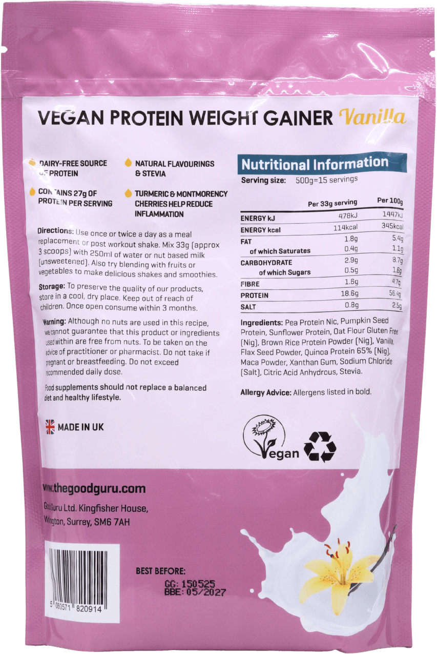 The Good Guru Vegan Weight Gainer Protein Vanilla 500g blends plant proteins for those looking for a natural approach to weight gain and muscle growth. Ideal for vegans, athletes, and those desiring a pure protein source. The formula includes pea, pumpkin, and sunflower proteins, providing essential amino acids for muscle recovery and development. Most components are organic, and the powder is easy to mix and easy on the stomach.