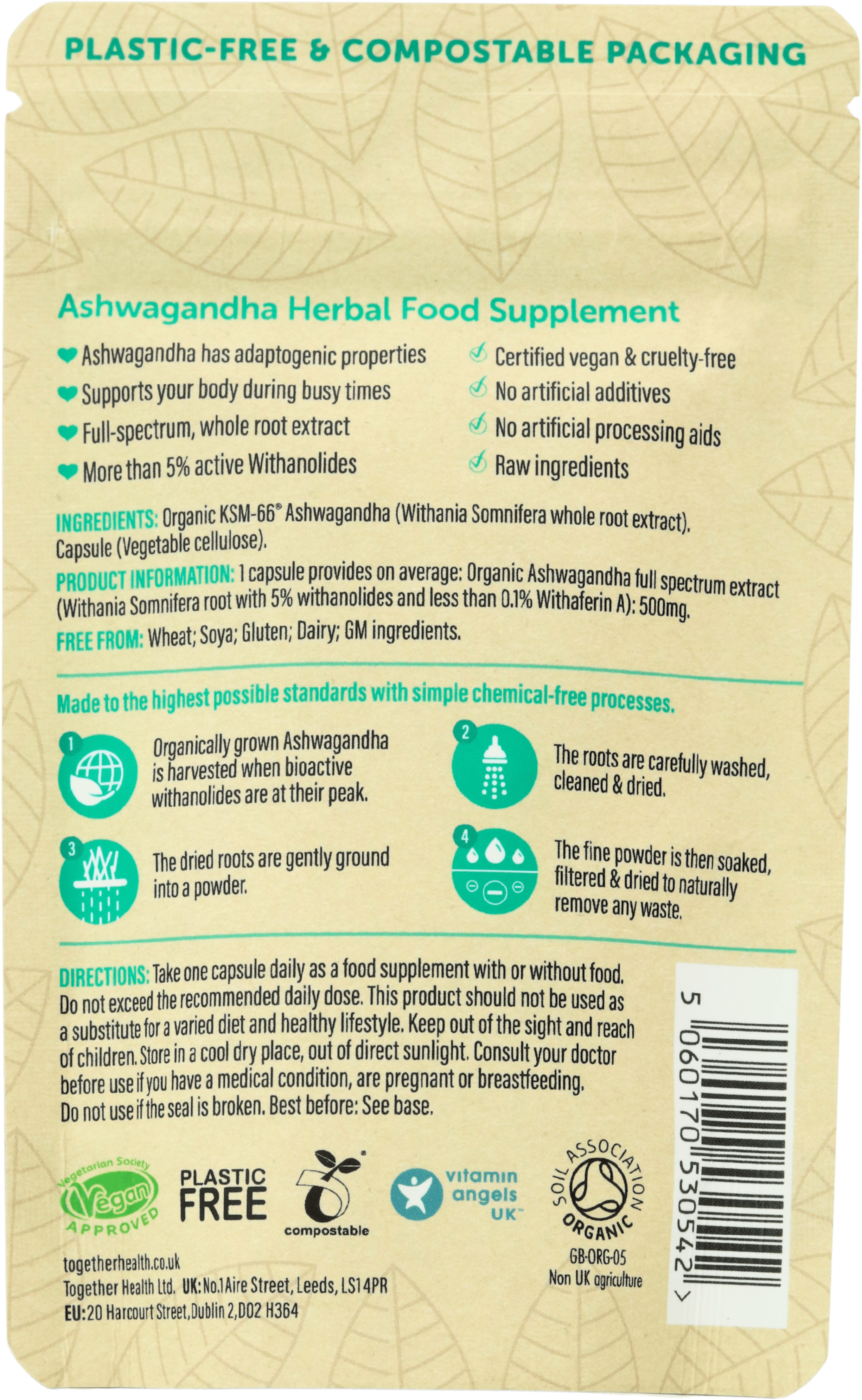 Together Health Organic Ashwagandha capsules are free from wheat, gluten, dairy, soya, fillers, binders, artificial colourings, flavourings, preservatives and GM ingredients. The product is also tested for contaminants such as heavy metals, supporting high quality and safety standards.