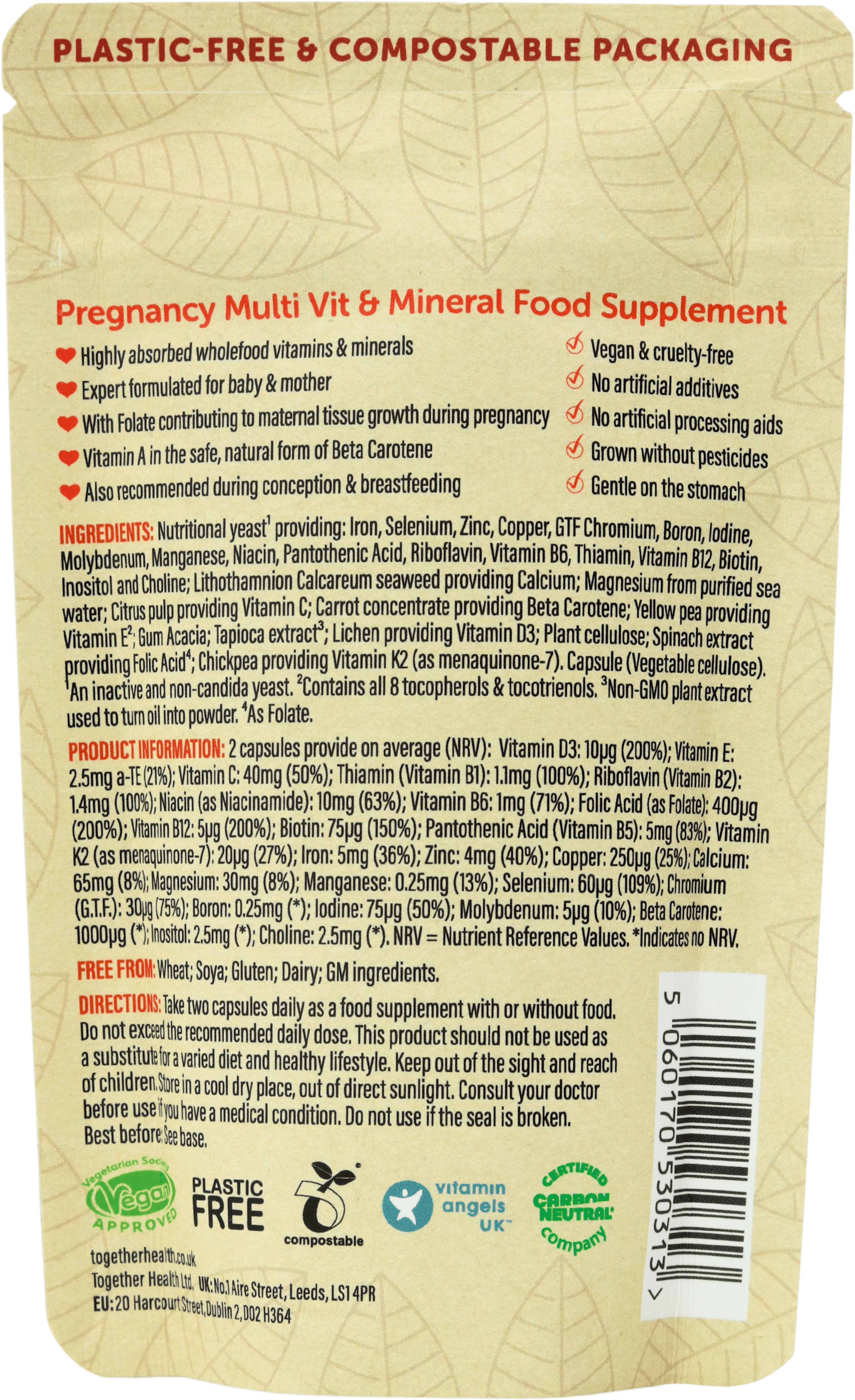 Together Health Pregnancy Wholefood Multivitamin is certified vegan and does not contain animal-derived ingredients, which suits plant-based or flexitarian lifestyles. In addition, it is free from gluten, wheat, dairy, soya, GM ingredients and artificial additives, and is independently tested for contaminants such as heavy metals and environmental pollutants.