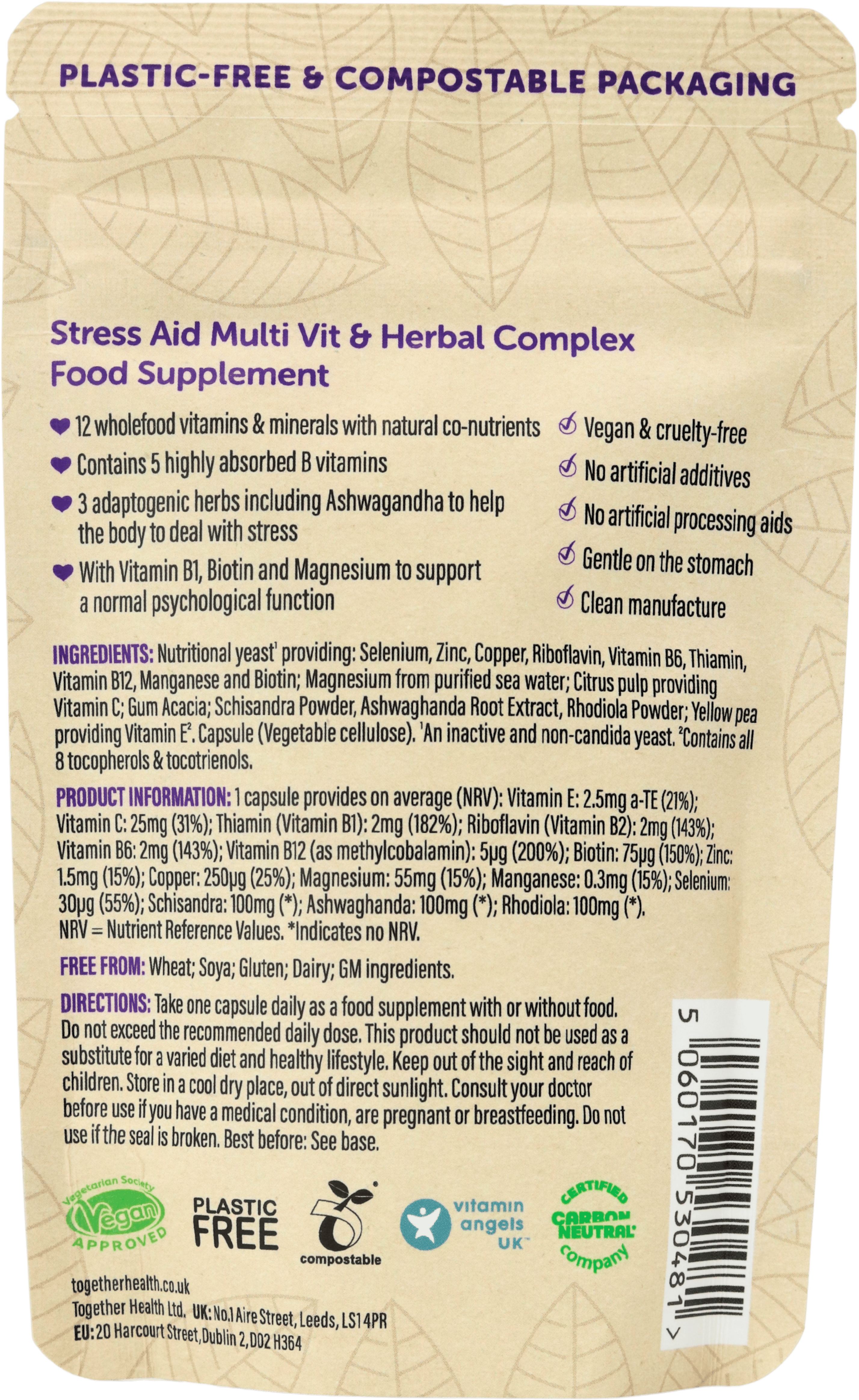 Together Health Stress Aid Wholefood Vitamin is suitable for both vegans and vegetarians, as it uses a vegetable cellulose capsule and plant, food and ocean-derived ingredients rather than animal-based sources. It is also free from dairy and other animal derivatives, which helps support different ethical or dietary choices.