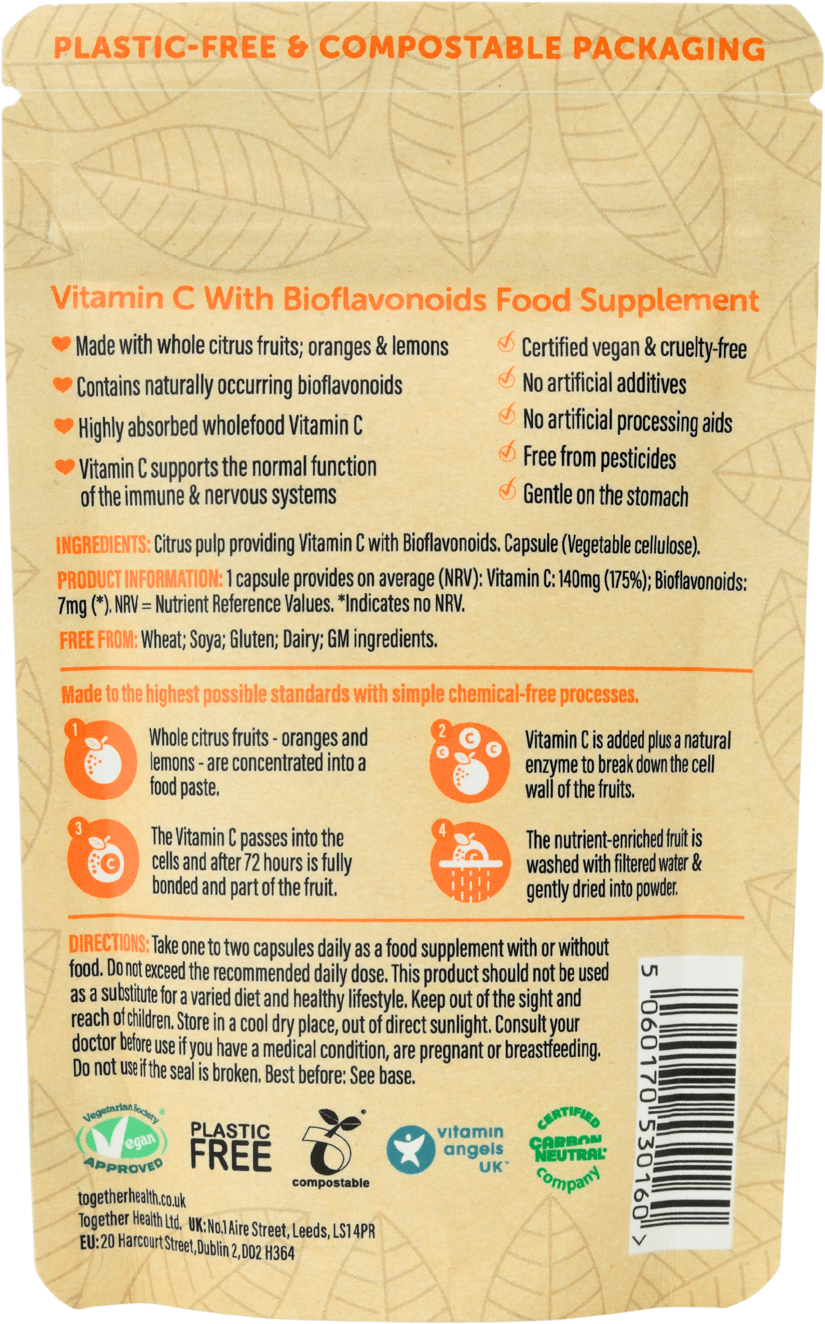 - Wholefood vitamin C from citrus: Provides vitamin C from oranges and lemons in a natural food complex, complete with bioflavonoids and co-nutrients that help enhance absorption and utilisation in the body.