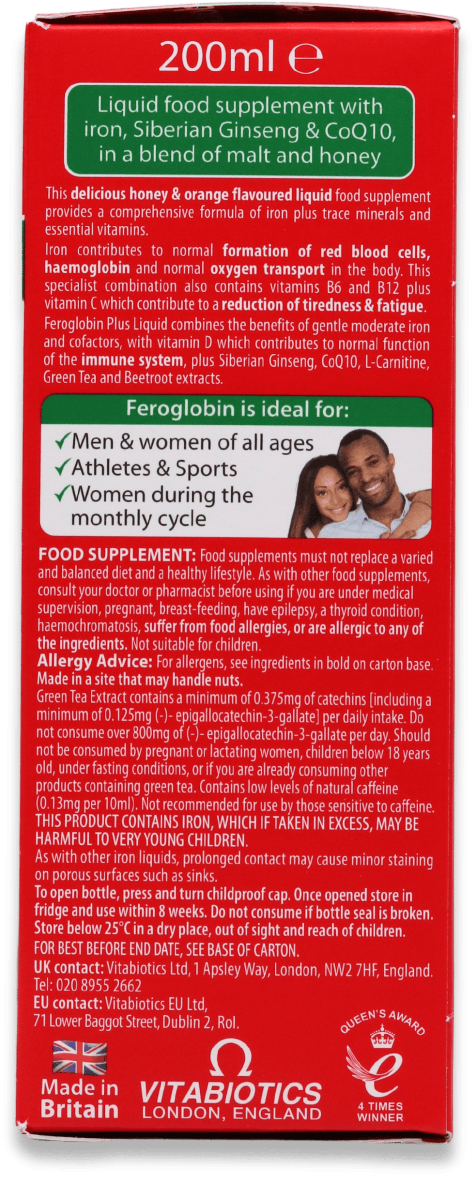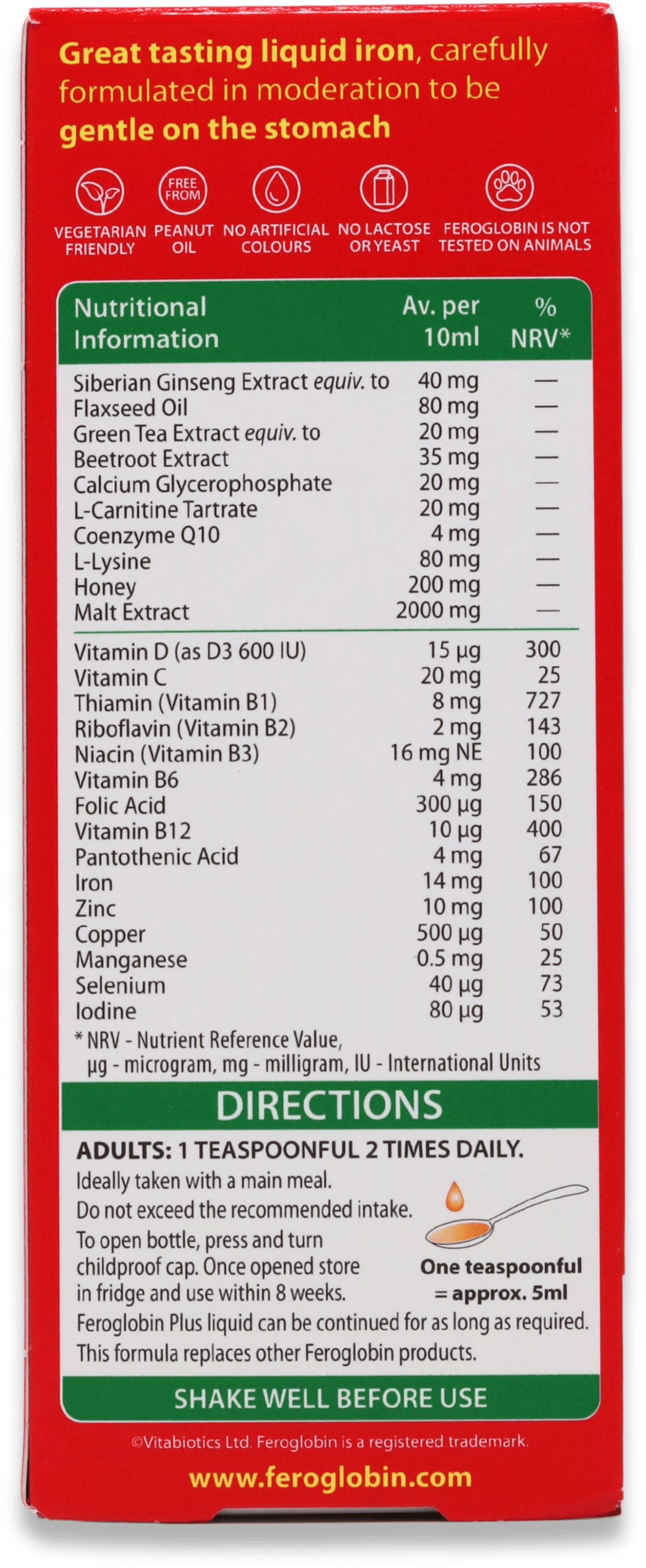 A delectable honey and orange flavoured liquid iron supplement, Vitabiotics Feroglobin Liquid is expertly formulated to help reduce tiredness and fatigue while supporting normal energy release. The blend of iron, zinc, and B vitamins, including folate, contributes to the normal formation of red blood cells and haemoglobin, ensuring proper oxygen transport throughout the body.