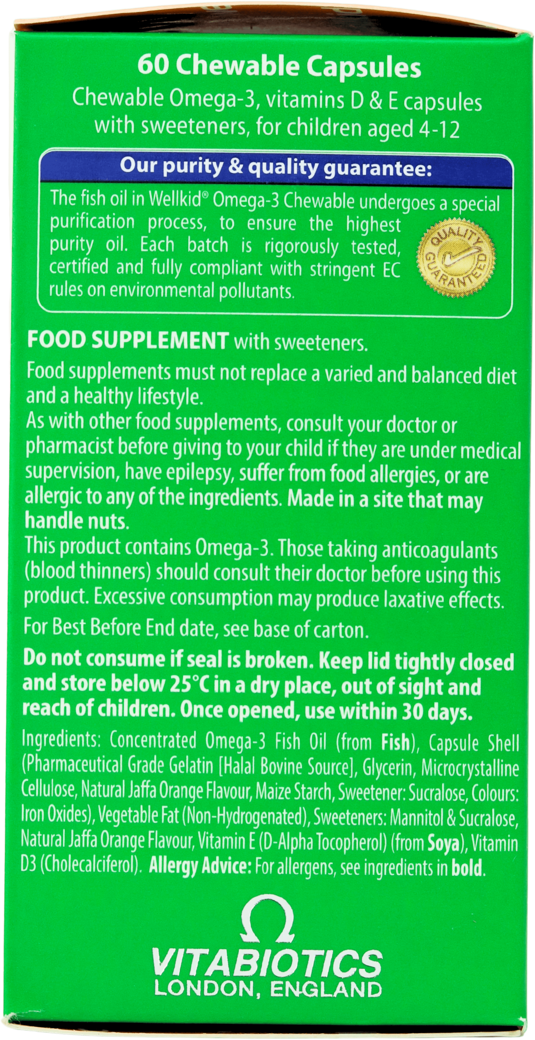 Concentrated Omega-3 Fish Oil (from Fish), Capsule Shell (Pharmaceutical Grade Gelatin, Glycerin, Microcrystalline Cellulose, Flavouring; Natural Jaffa Orange, Maize Starch, Sweetener; Sucralose, Natural Source Colours; Yellow Iron Oxide, White Titanium Dioxide Paste),Vegetable Fat (Non-Hydrogenated), Sweeteners; Mannitol & Sucralose, Flavouring; Natural Jaffa Orange, Vitamin E (D-Alpha Tocopherol) (from Soya), Vitamin D3 (Cholecalciferol)