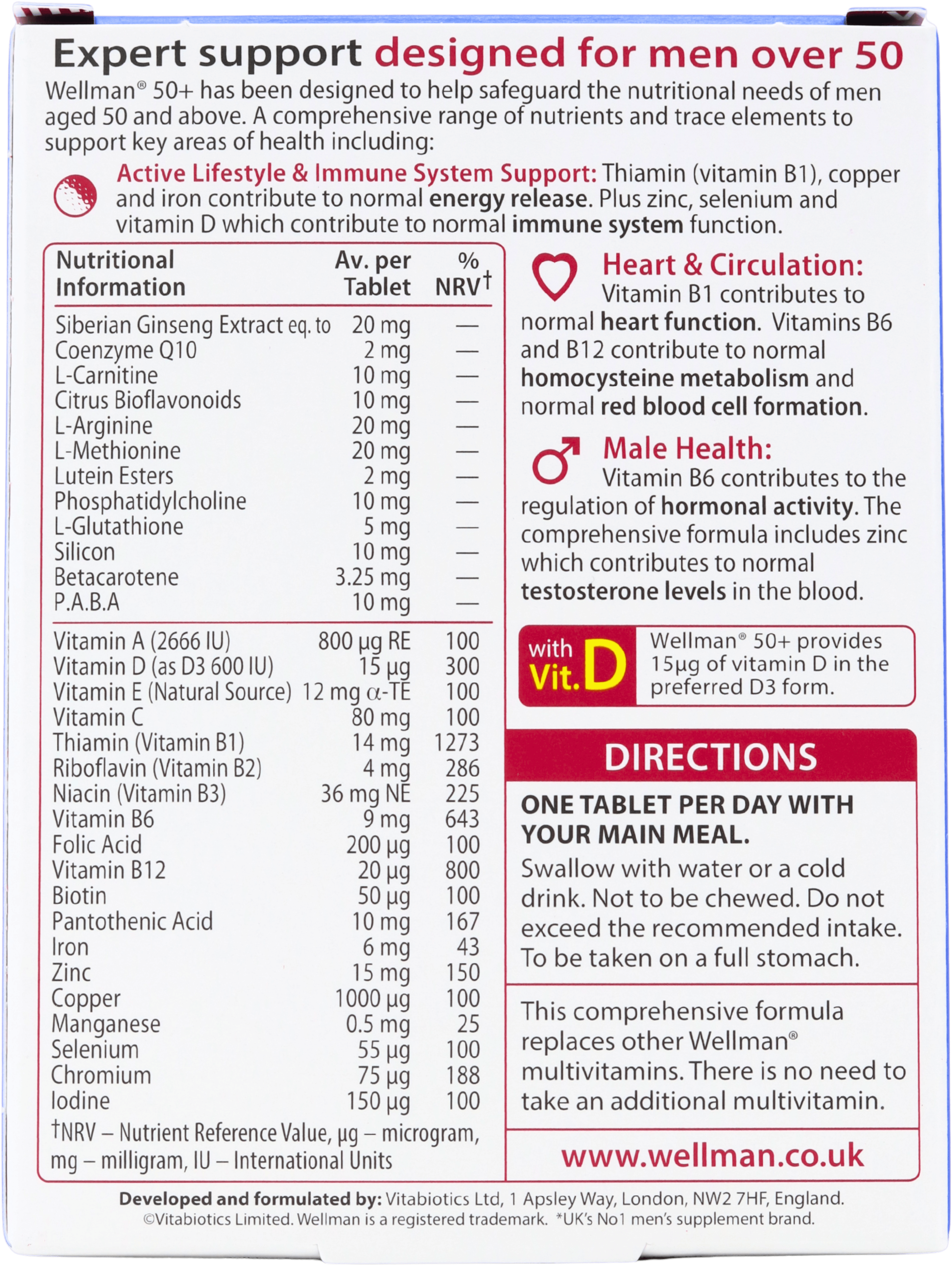 Supporting an active lifestyle and immune system function, Vitabiotics Wellman 50+ is enriched with thiamin (vitamin B1), copper, zinc, selenium, and vitamin D. These essential elements work together to provide energy release, regulate hormonal activity, and maintain normal immune system function.