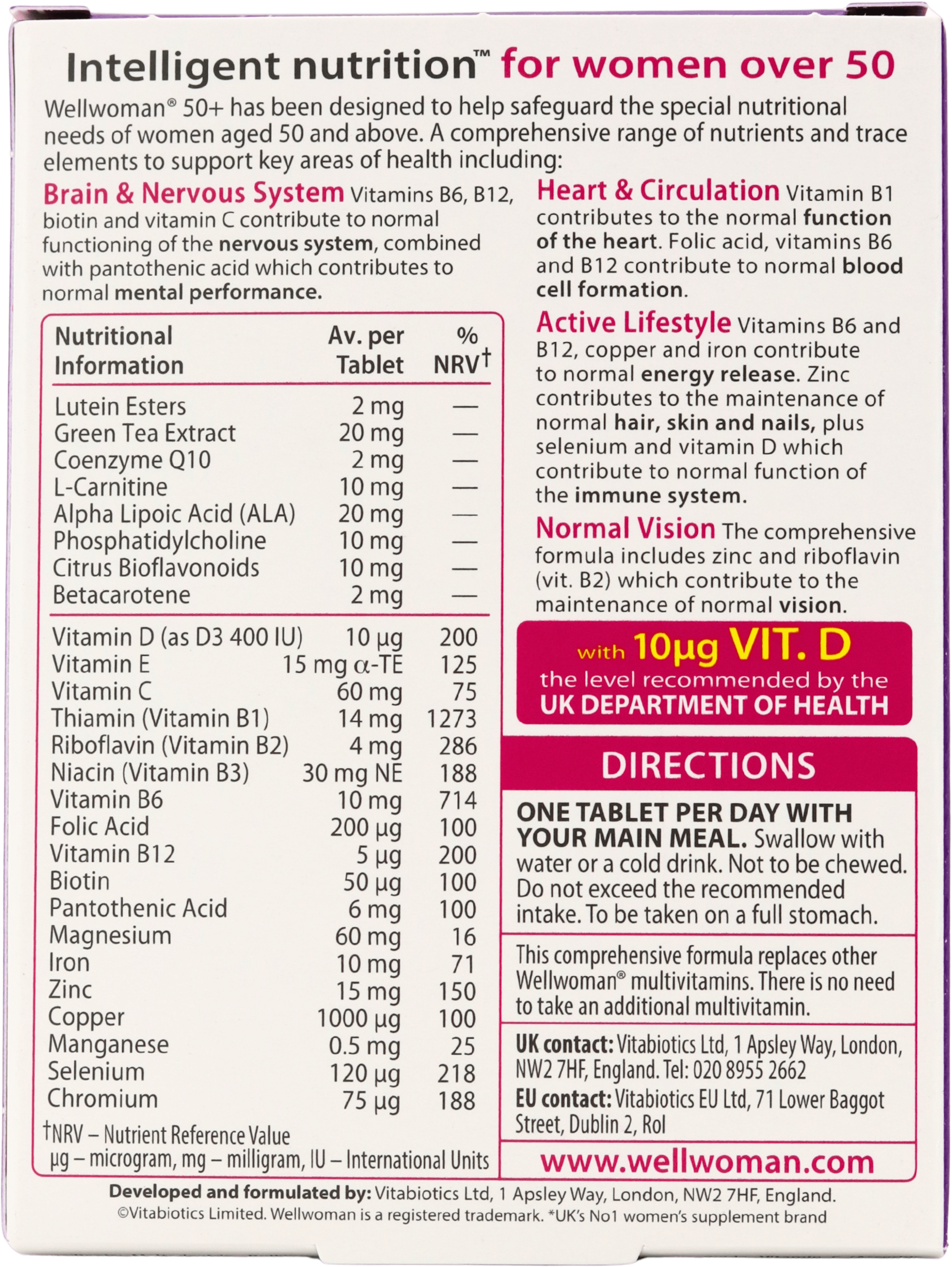 Taking one Wellwoman 50+ tablet a day will contribute to the reduction of tiredness and fatigue, helping to increase activity in your day to day lifestyle.