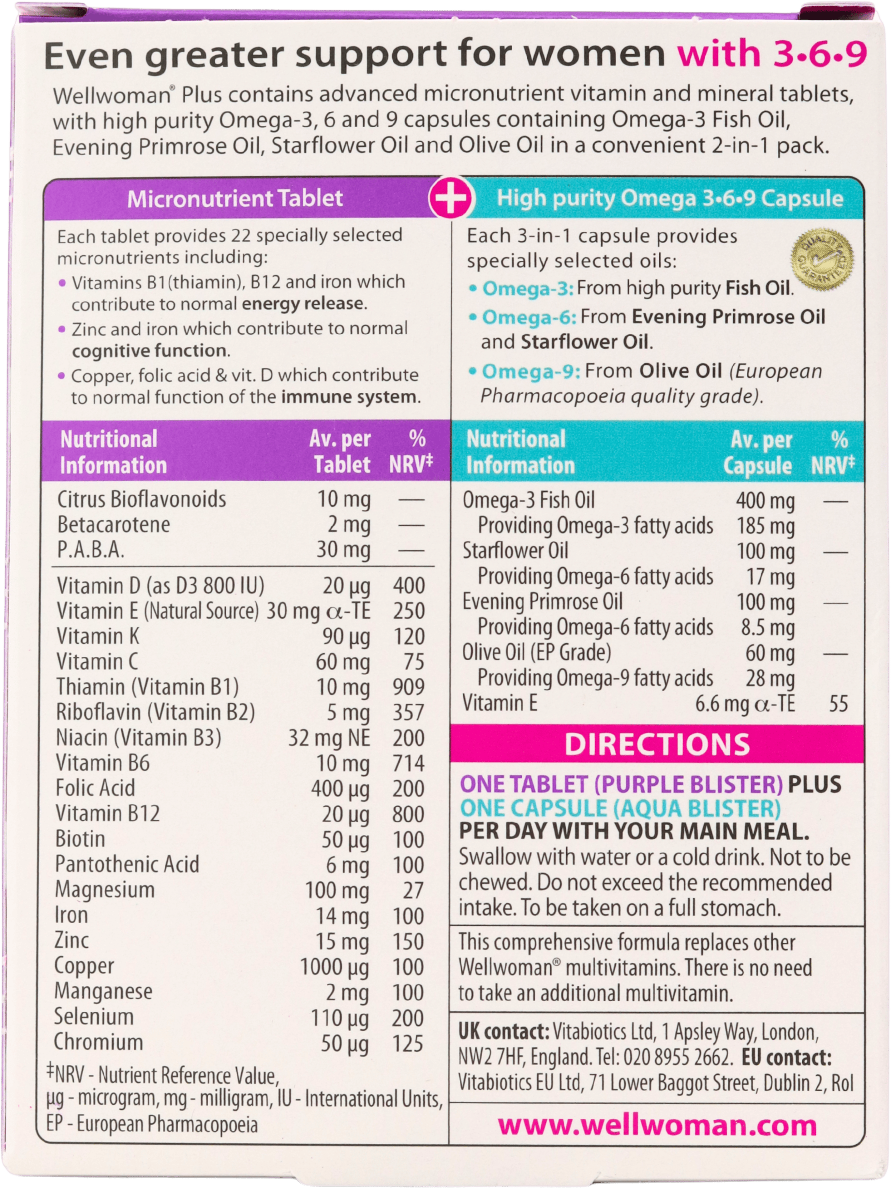 Wellwoman Plus contains advanced micronutrient vitamins and minerals to maintains your health and vitality.