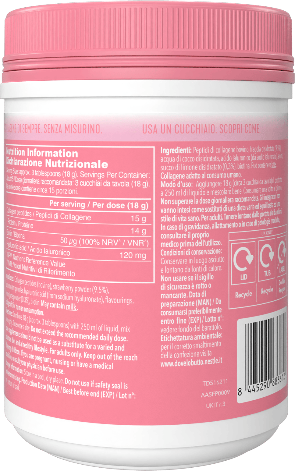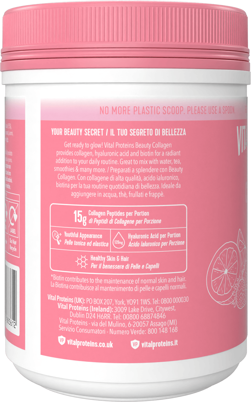 Contains: Collagen peptides (bovine), strawberry fruit powder (7.5%), inulin, flavourings, dehydrated lemon juice (2.4%), coconut water powder, hyaluronic acid (from sodium hyaluronate), biotin. The product may contain milk.