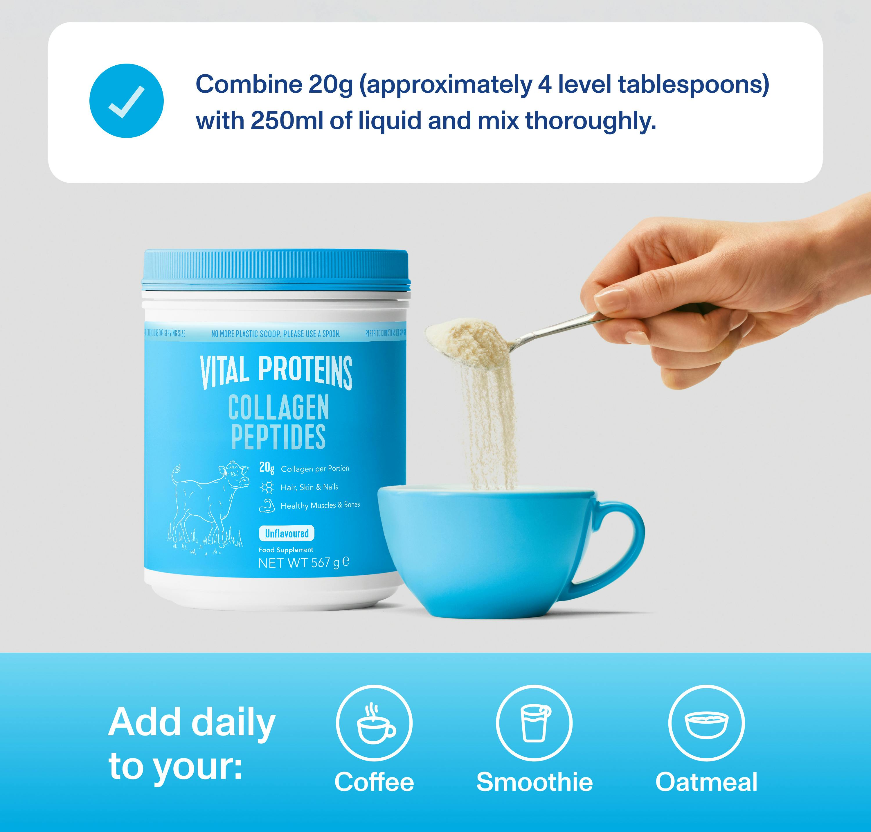 To use Vital Proteins Collagen, simply dissolve 2 scoops of it in your preferred hot or cold drink like coffee, tea, water, or smoothie.
