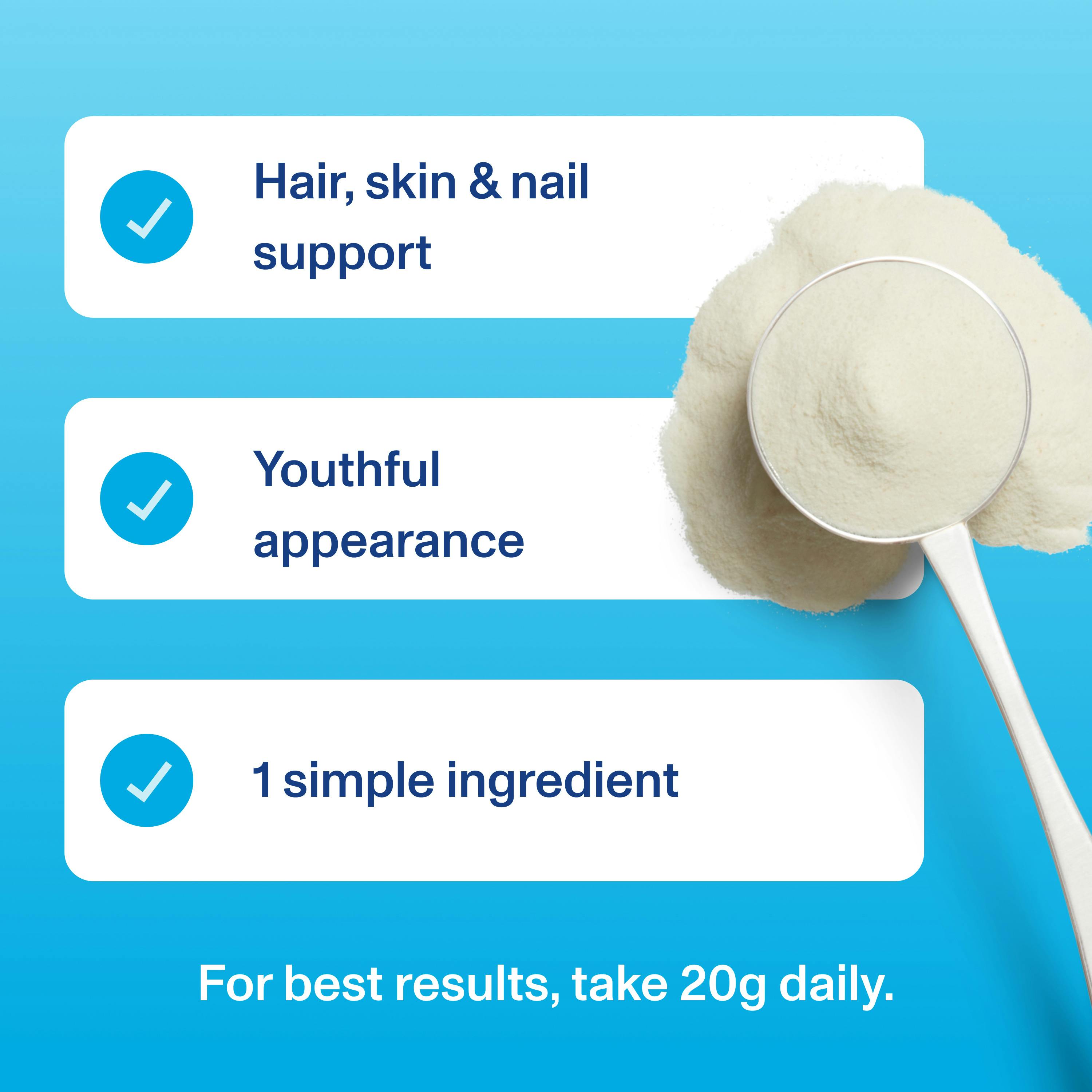 - 1-2 scoops or 20g of collagen per serving helps in maintaining healthy muscle mass.