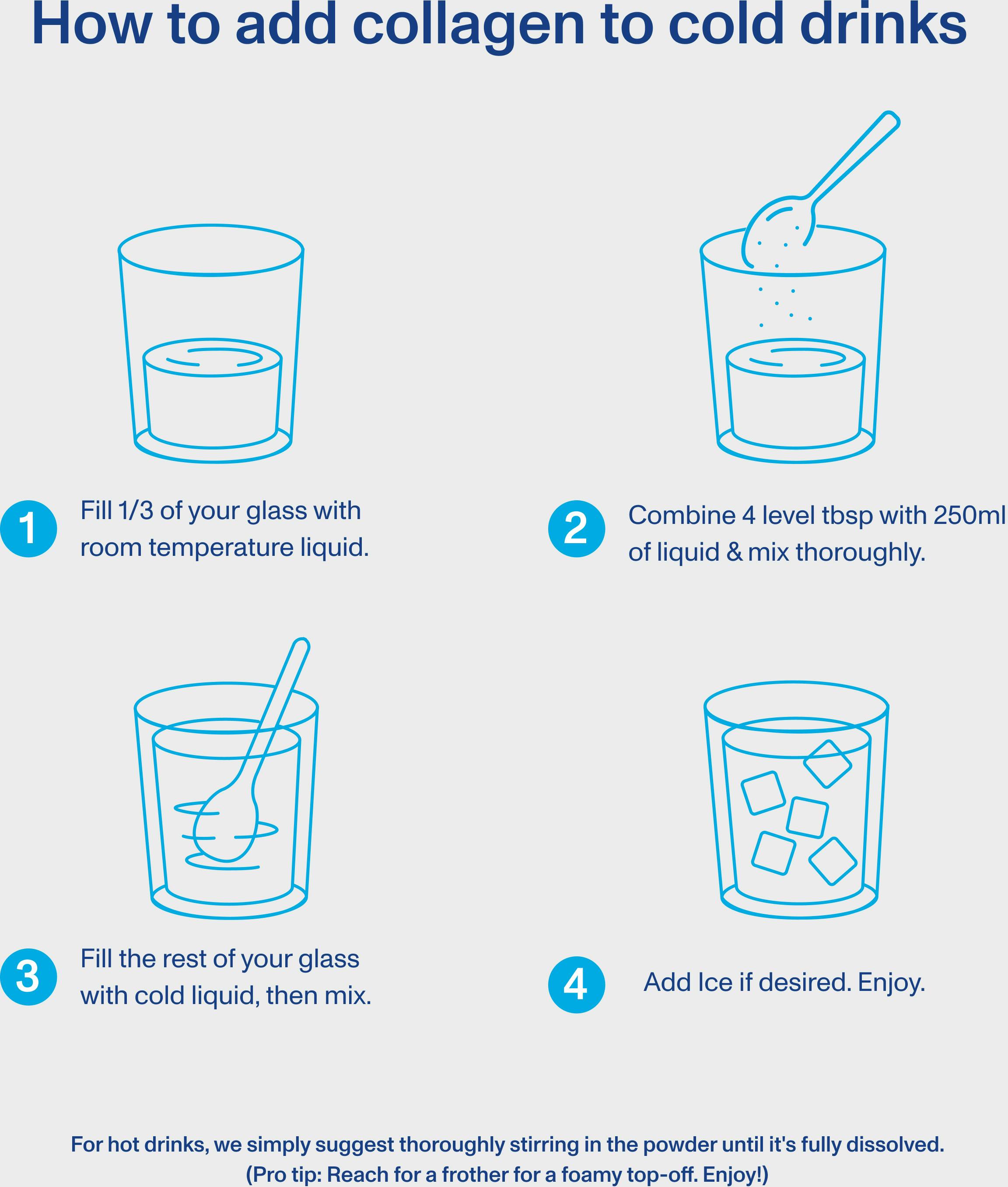 Premix a small amount of liquid with the collagen powder before combining it with the rest of your drink to ensure a smooth texture.