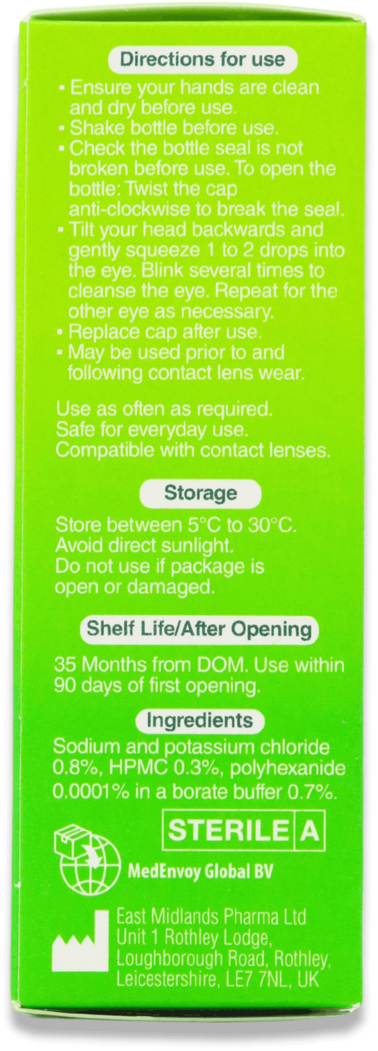 Soft isotonic buffered solution, with HPMC 0.3%, PHMB 0.0001%.