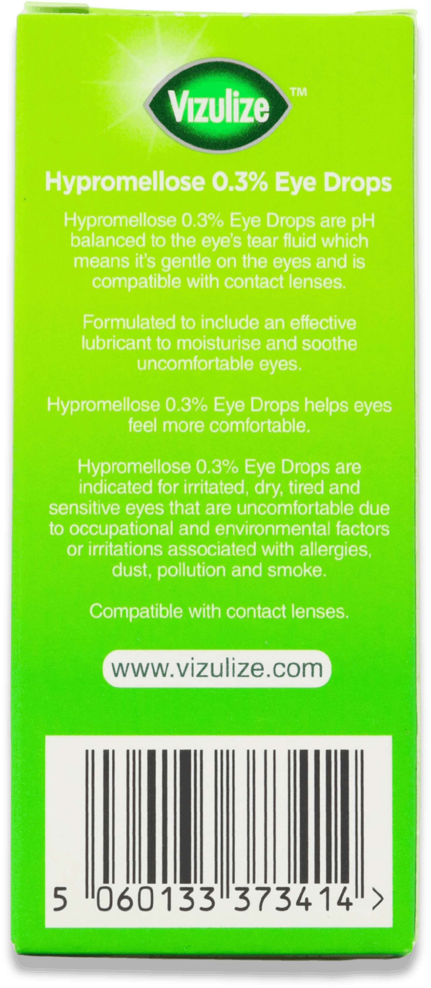 Vizulize Hypromellose 0.3% Eye Drops are effective against symptoms of dry and irritated eyes due to factors like extensive contact lens use, ageing, hormonal changes, and environmental challenges such as air conditioning, central heating, or pollution.