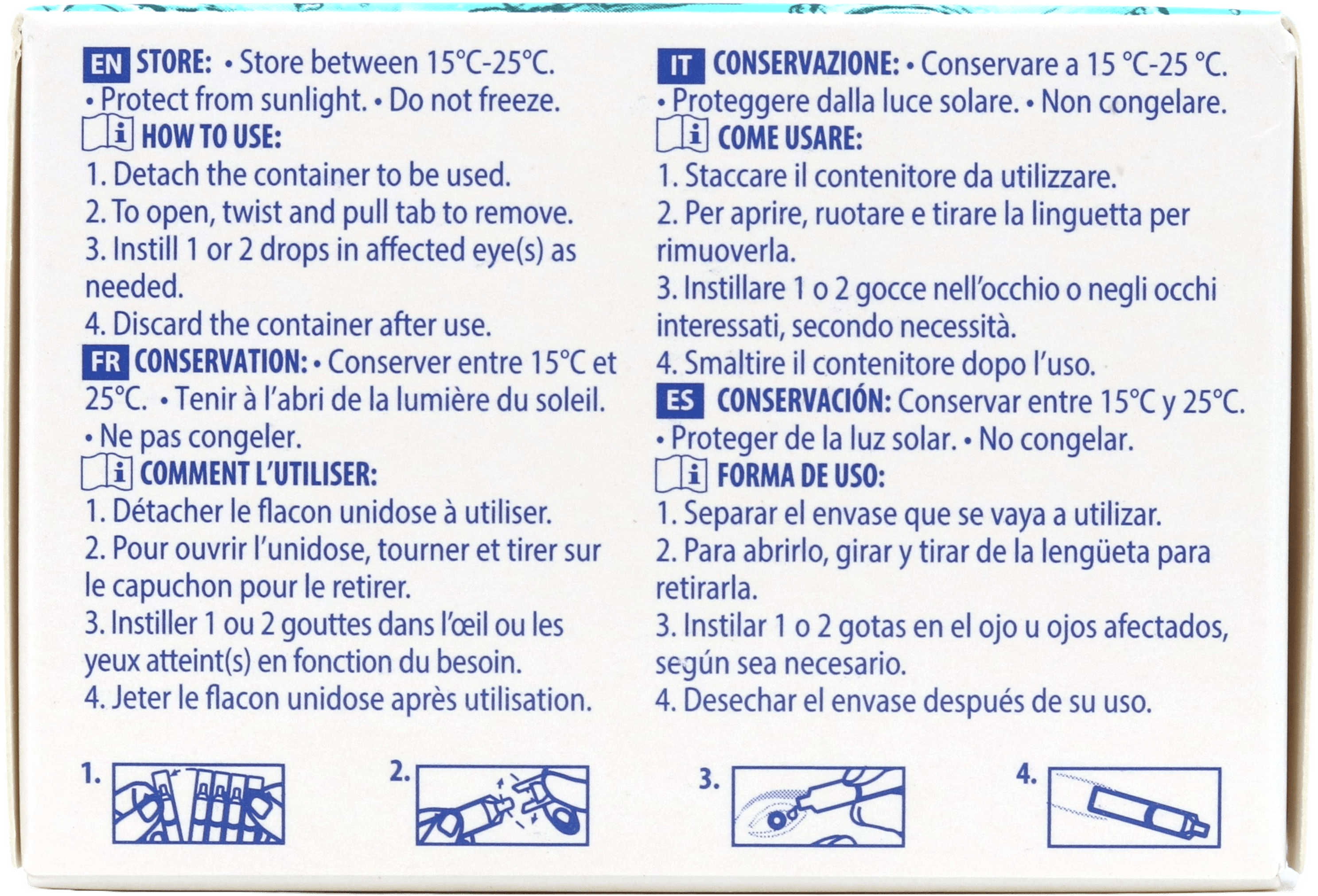 To use Xailin Fresh, detach the vial, twist and pull the tab to open, tilt your head backwards and look upwards. Gently pull down the lower lid of the eye, insert one drop of Xailin Fresh and blink a few times to spread the drops evenly over the surface of the eye. Repeat the process for the other eye if necessary and discard the vial after single use.