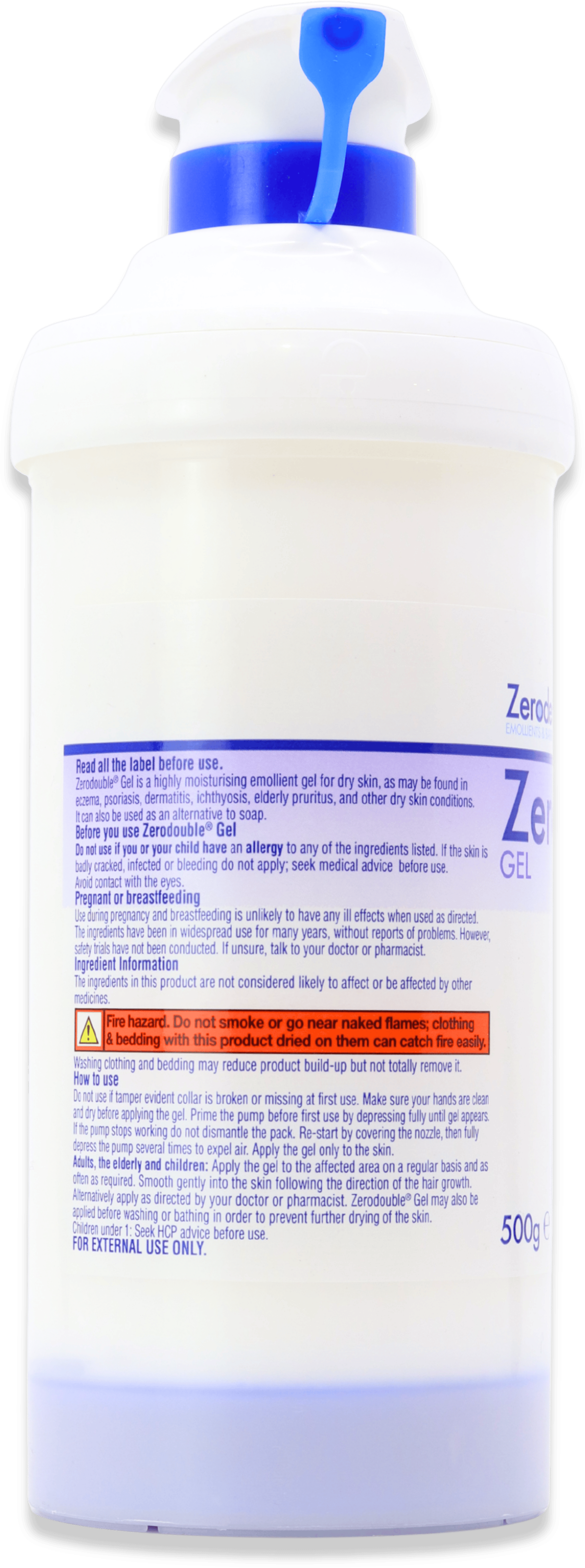 Zerodouble gel is an emollient, and although emollients are a very effective way to manage dry skin conditions, they are flammable. Any fabrics, such as clothing, bedding, dressings, or bandages, can become much more flammable when they’ve been in contact with this product. Remember to stay away from naked flames while using this gel and do not smoke. You should change and wash any clothing, bedding, or dressings which come into contact with emollients regularly to help reduce product build-up.
